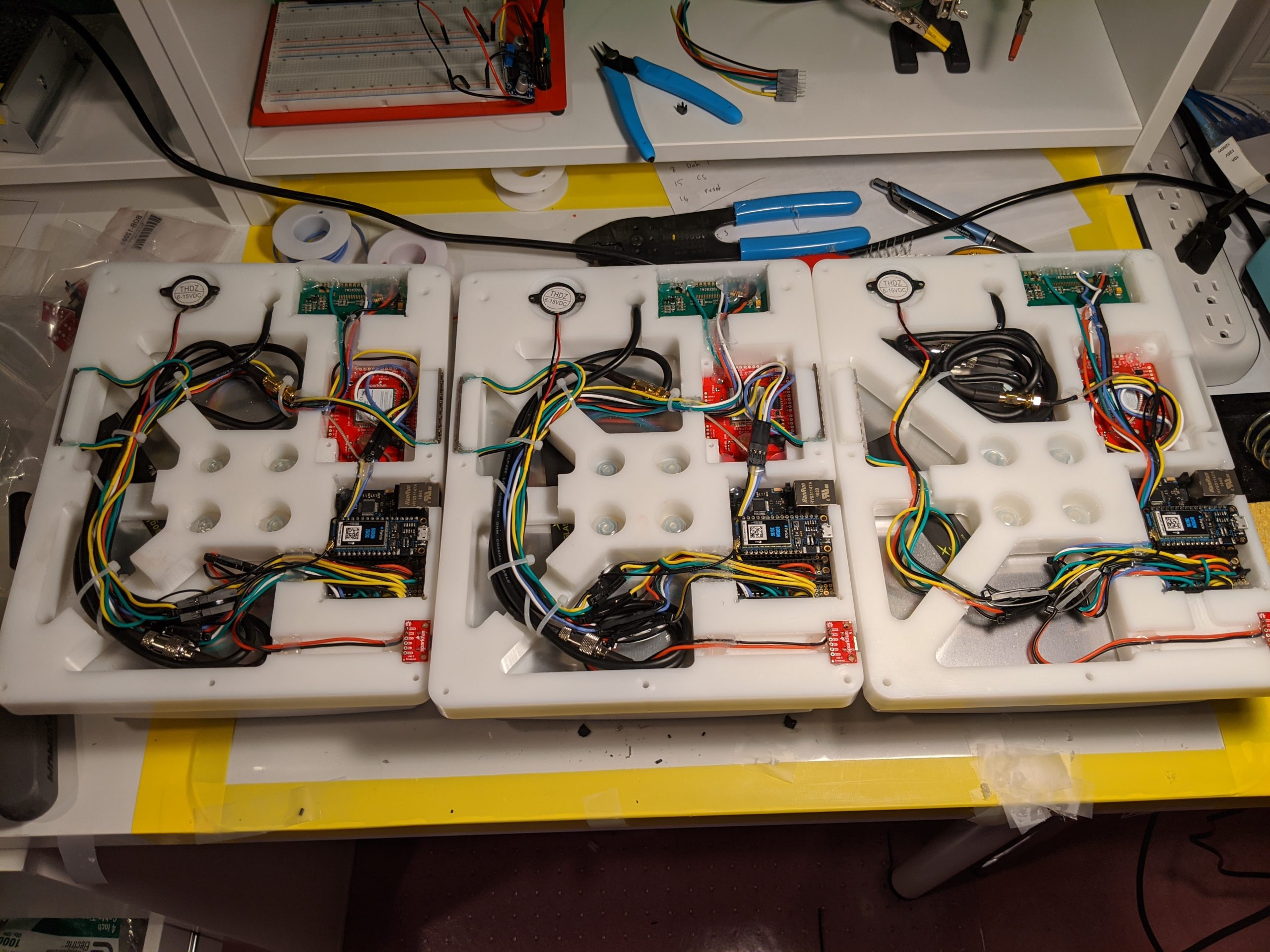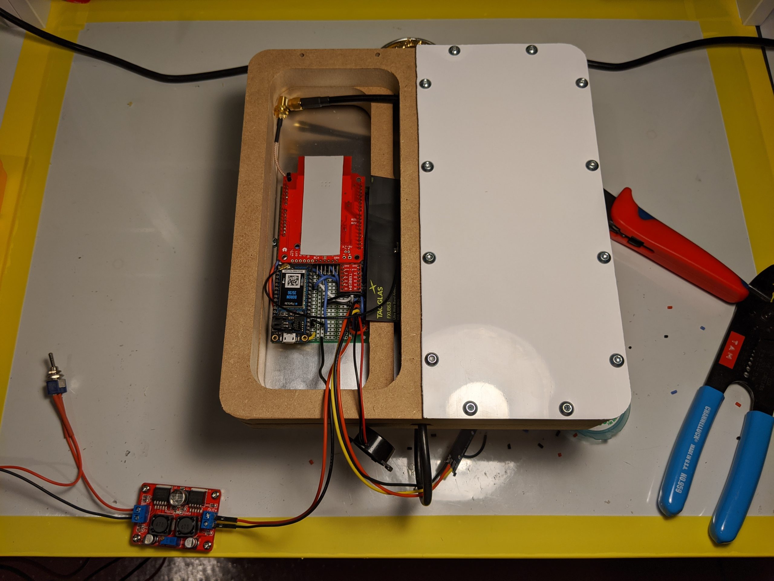 For this initial design, off the shelf components were solder on breadboards and packed into the case. Later designs use a custom surface mount board.